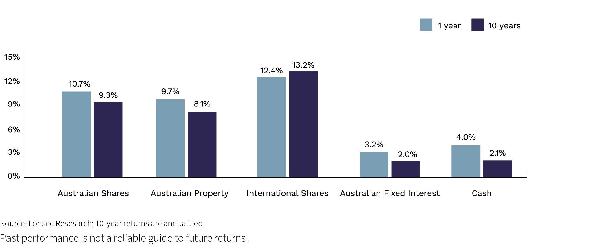 The chart below compares one and ten year returns for the major asset classes, as at 31 December 2025.